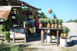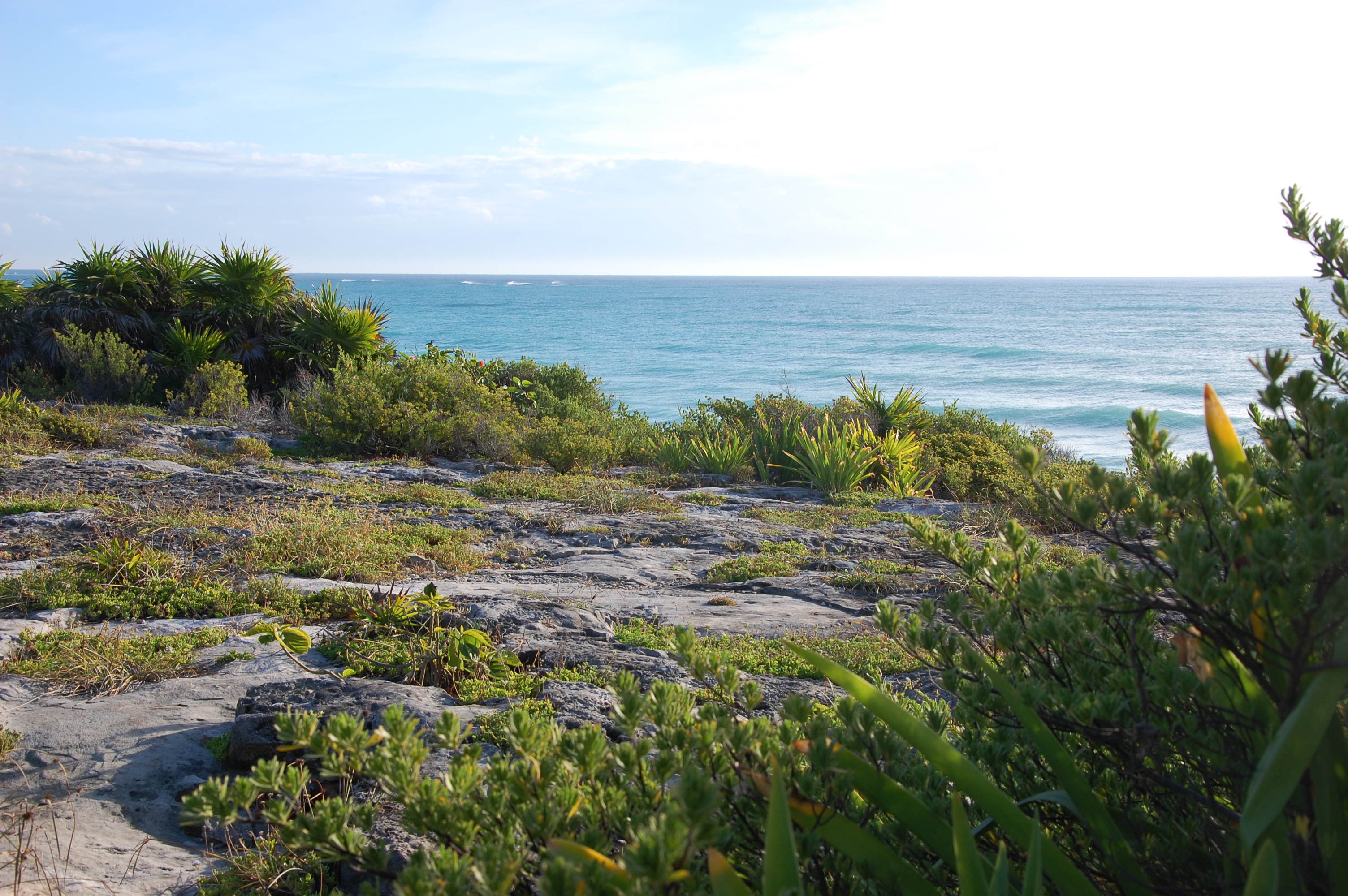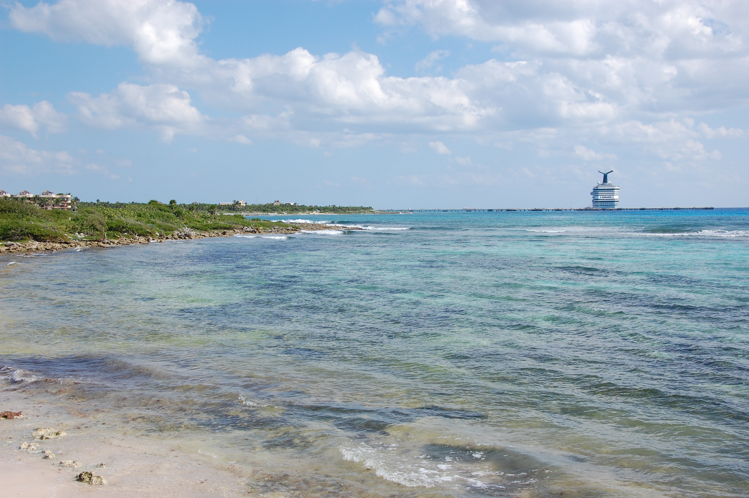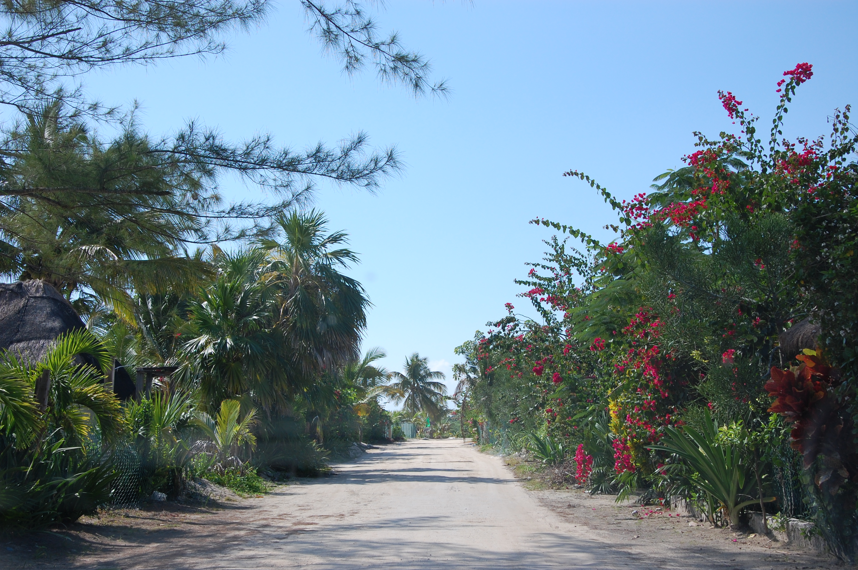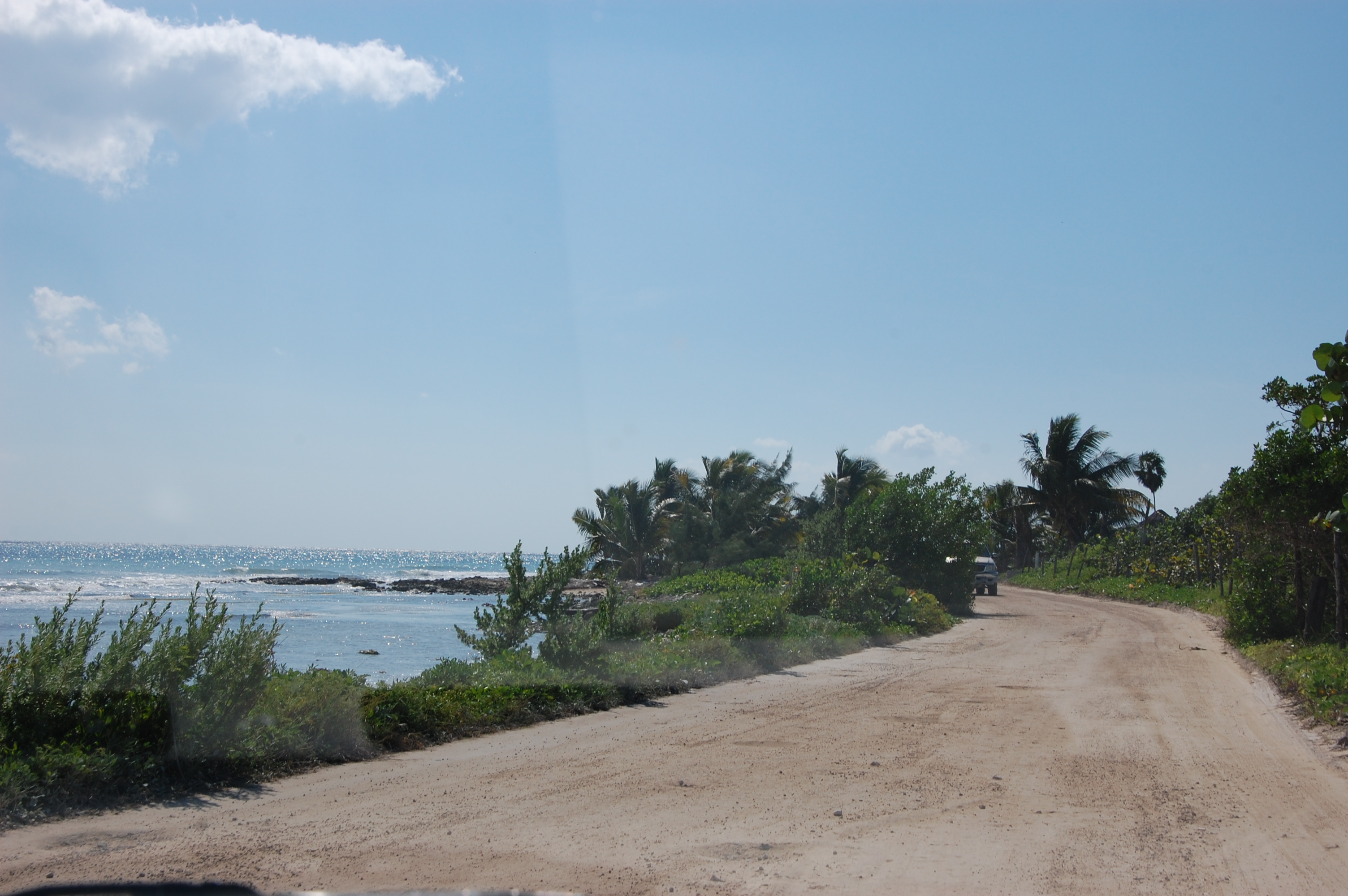 Comme il n'y a que 200km à faire sur une grande route pour rejoindre Tulum depuis Bacalar, nous décidons de nous rallonger un peu en allant visiter le petit village de Majahual, un détour de 120km aller-retour par une route en excellent état. Nous avons lu que le village de pêcheurs devient fort occupé de manière intermittente depuis qu'il accueille des bateaux de croisière, mais qu'en dehors de ces visites, c'est très tranquille. Nous arrêtons au phare au bout de la route, et depuis ce promontoire nous avons une superbe vue sur la magnifique mer des caraibes et sur un énorme bateau de croisière qui vient d'accoster! Nous apercevons au loin les gens qui descendent pour s'engouffrer dans des navettes qui les amèneront au village! Nous prenons quand même la rue principale, en pressentant le pire, mais au bout du compte il semble que la plupart des passagers se dirigent vers un même "beach club" où ils profitent des services et des installations pour la journée. Nous sortons du village par une route de terre qui longe le bord de la mer, c'est extraordinairement beau et désert. Nous choisissons un spot au hasard où nous nous installons pour luncher tranquille. Nous ne verrons au final que deux passagers du paquebot, sympathiques, qui prennent une marche sur la plage pour s'éloigner un peu de la foule et qui sont, comme nous, enthousiasmés par la beauté du lieu.