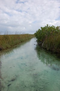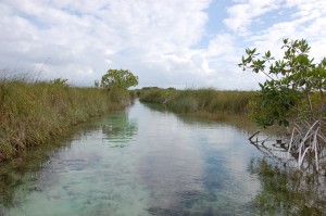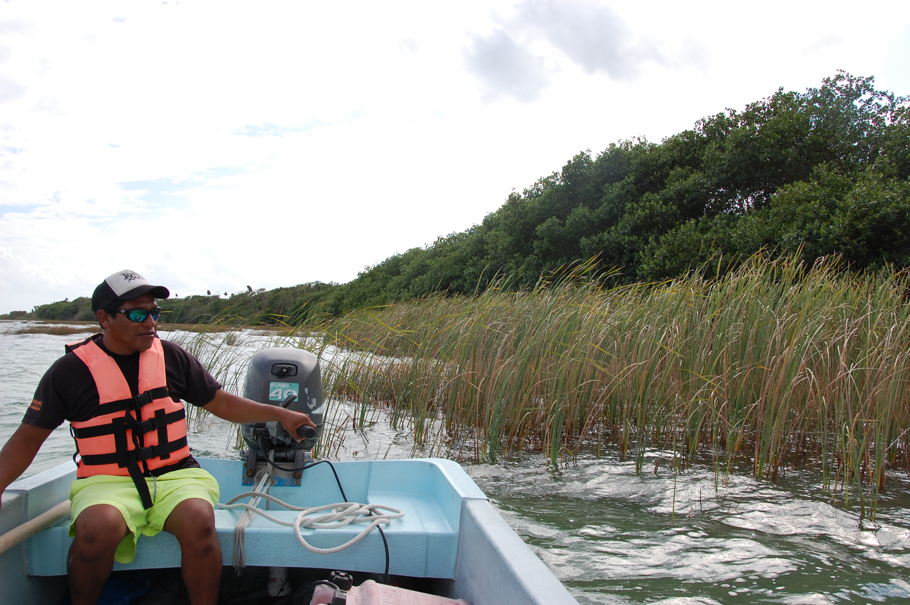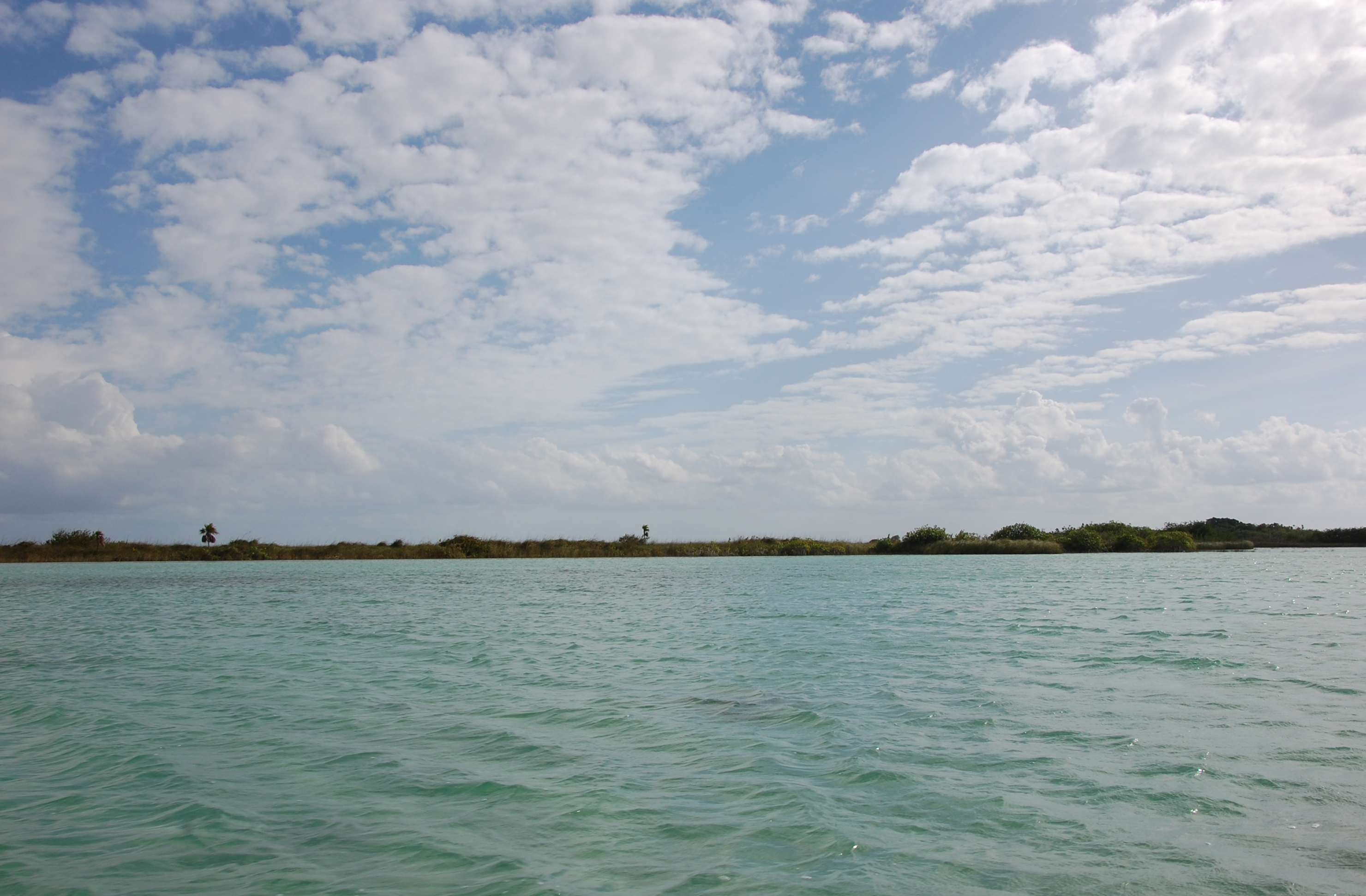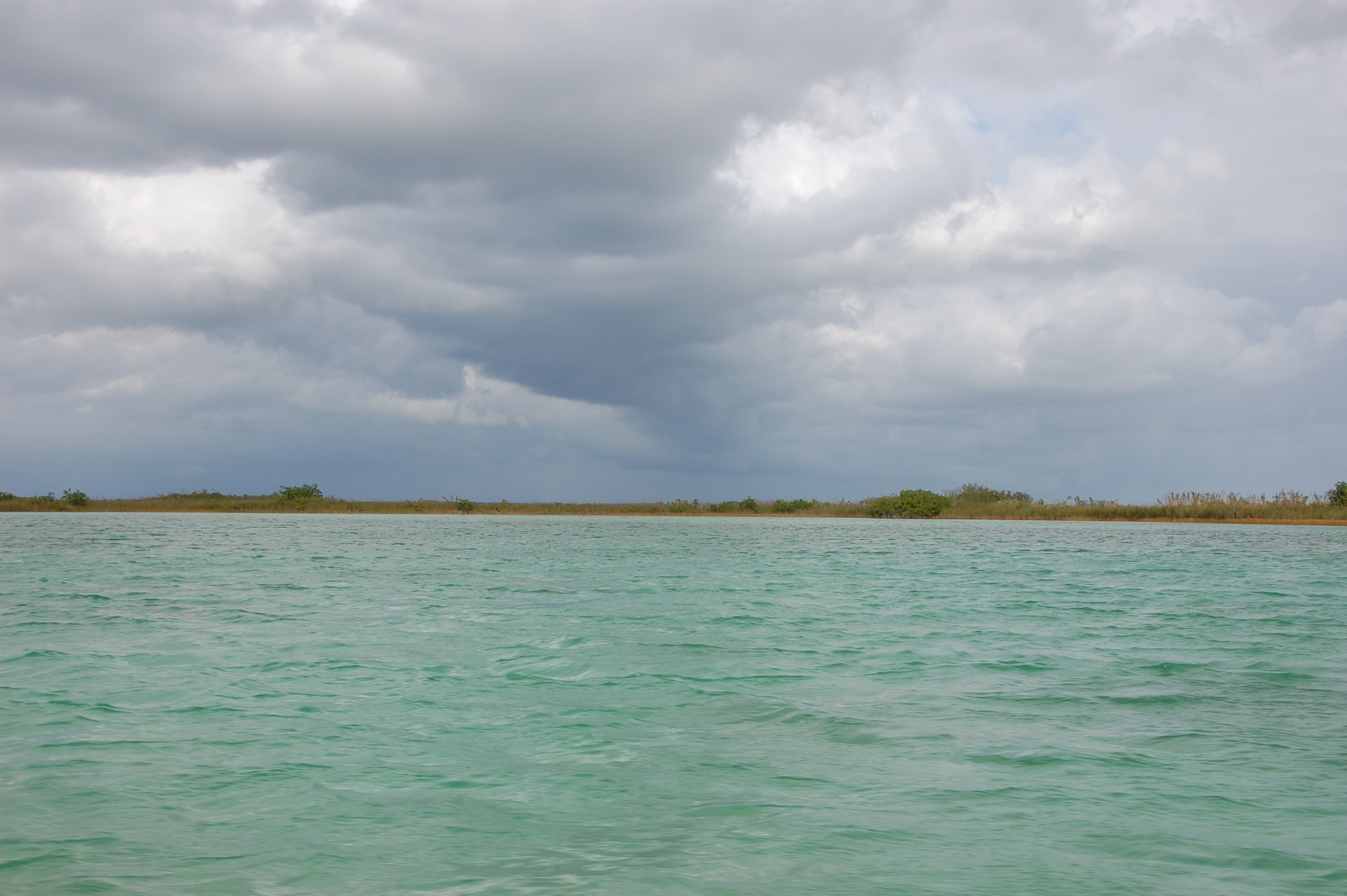 Nous partons ensuite rejoindre Muyil où nous avons rendez-vous avec Pastor Caamal, un guide maya de la coopérative locale Indigena Maya Ecotours, avec qui nous allons faire un petit tour dans la réserve Sian Ka'an. Le temps s'est couvert et cela nous arrange bien pour partir deux heures en bateau. Nous avons choisi l'excursion la plus courte afin de ne pas prendre toute la journée et aussi parce que les excursions dans la réserve sont quand même assez dispendieuses. Nous traversons la première lagune d'eau douce puis prenons un petit canal creusé par les maya et qui a été naturalisé avec le temps. C'est superbe. Il y a beaucoup de poissons d'eau douce et même des poissons d'eau salée qui remontent jusqu'à la lagune par les canaux. Le fond du canal est de limon de calcaire. Le guide nous donne quelques explications sur la faune et la flore que l'on retrouve ici, dans les deux habitats, la mangrove et la savane. Les nuages noirs et le soleil rendent le paysage dramatique. Nous arrivons à la deuxième lagune, immense celle-là, que nous traversons aussi jusqu'à un autre canal plus étroit dans lequel nous nous engouffrons.