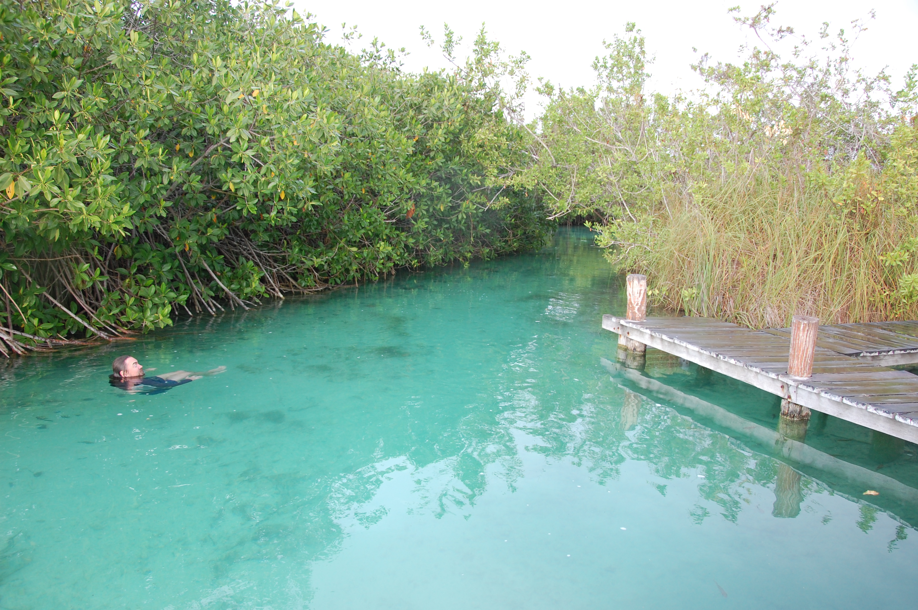 Nous arrivons à un quai où deux autres lanchas sont déjà amarrées. Une famille a déjà revêtu les vestes de flottaison et notre guide nous annonce que si nous le désirons, nous pouvons faire de même pour nous laisser flotter dans le canal, portés par le courant jusqu'à un autre quai où il viendra nous chercher. La descente dure une quarantaine de minutes. Nous sommes tentés et questionnons la présence de crocodiles: il nous explique qu'il y en a dans la réserve, mais qu'ils sont nocturnes, et qu'aucun n'a jamais été vu dans ce canal, et que d'ailleurs ce ne serait pas bon pour leur entreprise! Tu parles Charles! Bon. Nous décidons d'y aller, d'autant plus que la famille s'est engagée avant nous, ils sont 7 personnes, dont trois enfants, nous nous disons qu'ils serviront d'appât! La descente est vraiment splendide. Le courant nous porte sans aucun effort, l'eau est fraîche et claire, nous voyons le fond et tous les poissons et les plantes qui s'y trouvent. Pendant la balade, il commence à tomber une petite pluie qui crée des arcs-en-ciel et fait reluire les joncs et les feuilles des arbres aux abords du canal. C'est d'autant plus beau. Arrivés au quai, notre guide nous attends avec nos affaires, sandales, serviettes, appareil photo. La famille avant nous remonte dans la lancha car leur balade se poursuit un peu plus loin. Quant à nous, nous revenons à pied par des trottoirs de bois qui traversent ce magnifique habitat. Nous mettons environ vingt minutes pour revenir à la lancha. Nous nous baignons à nouveau dans le canal avant de rembarquer pour le retour. Comme il vente beaucoup et que le temps est toujours menaçant, nous ne nous attardons pas trop dans les lagunes où malgré la pluie nous apercevons quelques oiseaux, hérons, aigrettes, urubu. Pendant les 25 kilomètres du retour sur Tulum, nous baillons plusieurs fois, complètement relaxés par cette belle balade en eau fraîche et les quelques sueurs froides que nous nous sommes quand même donnés avec ces histoires de crocodiles!