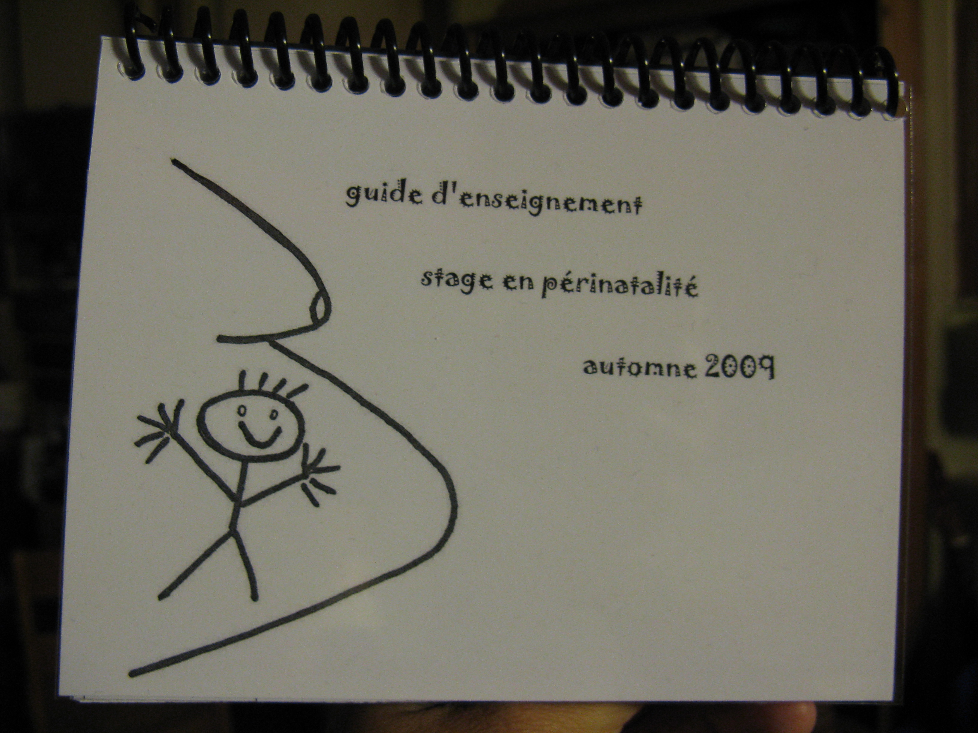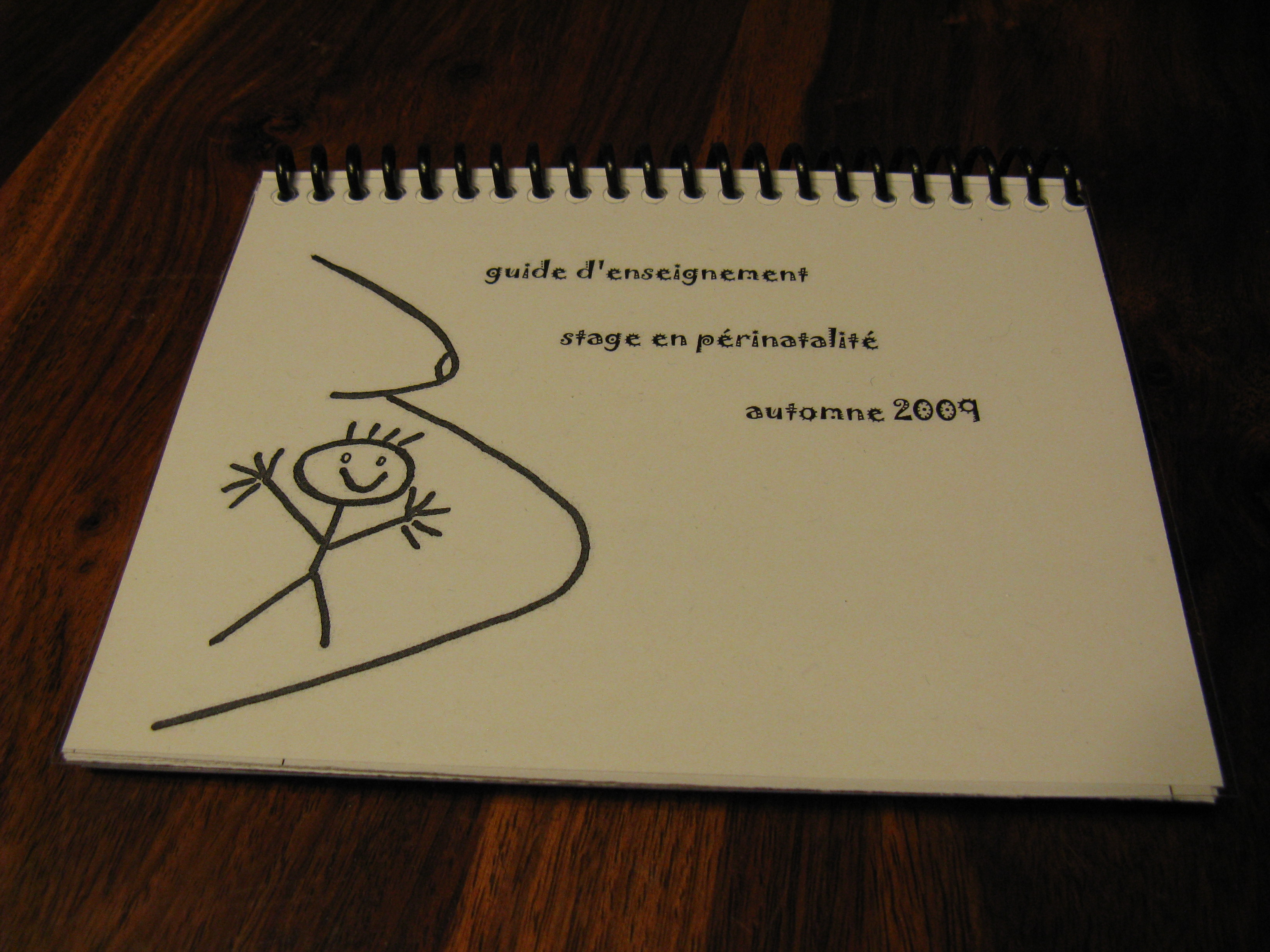 Le voici d’ailleurs, ce guide. Alors conseil aux futures étudiante en périnatalité: décidez et mettez au point la mise en page AVANT la rédaction du guide car vous pourriez vous retrouver à devoir faire un colossal travail de transcription pour essayer de faire fitter tout le contenu dans des quarts de page de 81/2 x11. J’ai passé une vingtaine d’heures à retranscrire toutes les informations, et Martin a passé plusieurs heures à effectuer la mise en page, imprimer et couper les guides. Nous les avons fait relier à la coop du cégep. 2,50$ par guide. Trois sur sept n’étaient pas bien reliés, il a fallu les réimprimer, les recouper et les refaire relier, gratuitement mais quand même, délai supplémentaire.