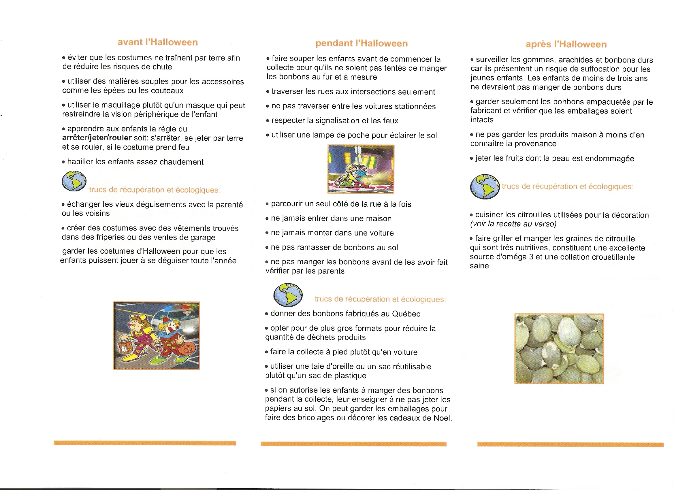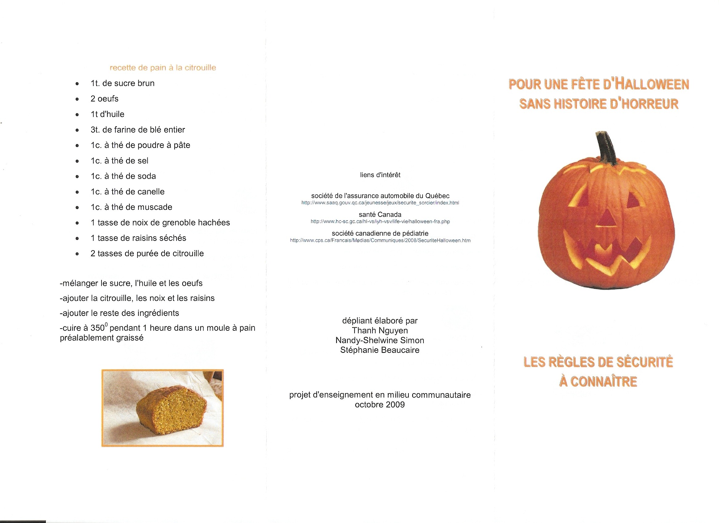 J’ai quand même réalisé en travaillant sur ce dépliant que passer l’Halloween était devenu bien compliqué!! Faut éclairer le sol avec une lampe de poche, ne pas avoir un costume trop long, ne pas courir, ne pas porter de masque, s’assurer de n’avoir aucune partie de costume dangereuse (épée en plastique, c’est non!) misère …. certains recommandent même de passer avant la noirceur!???! quoi, à 15h30??? quand personne est chez lui!??!?