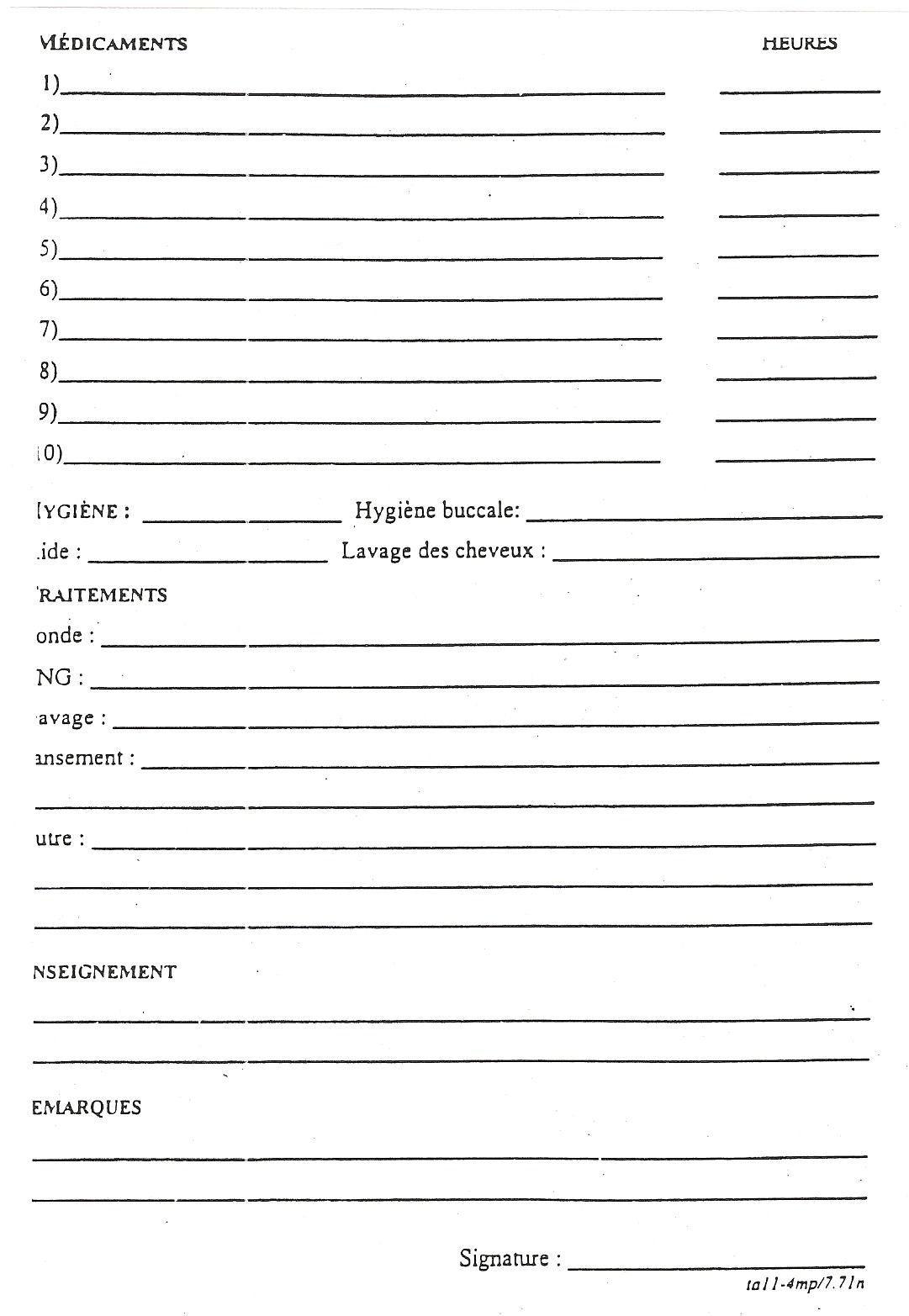 J’ai tout de même récupéré quelques affaires à partager …Un mémo de soins « en blanc »: c’est le papier qu’on traîne toute la journée, toujours dans notre poche (les formats changent selon les départements), et sur lequel on inscrit TOUT!! Tout ce que l’infirmière du quart précédent nous donne comme infos au rapport, puis les données qu’on recueille: signes vitaux, dosage, soluté, visite médicale, allaitements … jusqu’au moment où on va pouvoir transcrire tout ça sous forme de notes évolutives qui seront au dossier, dont je vous mets un brouillon plus bas. En stage, on met nos notes au brouillon pour les faire vérifier par la prof avant de les transcrire dans le vrai dossier du client, pour ne pas faire de boubou.