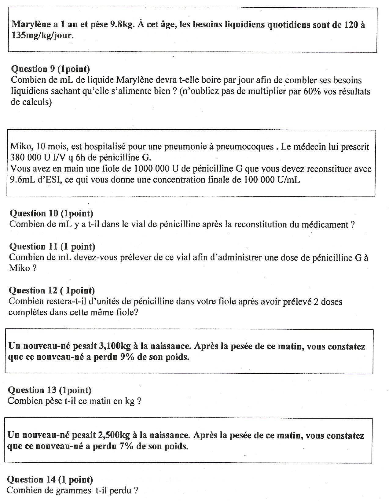 J’ai fait des calculs tout au long de la session par la force des choses: pour préparer les stages, pour administrer des médicaments, aux examens de soins aussi … On nous a fourni un test maison pour nous pratiquer en nous disant que si nous parvenions à le réussir dans le temps alloué, soit 1h30, nous réussirions sans problème l’examen final. J’ai donc fait l’examen maison 3 fois, le samedi, le mardi et le mercredi précédant le test de calcul, qui se déroulait jeudi pm, après le contrôle 3 de pédiatrie.