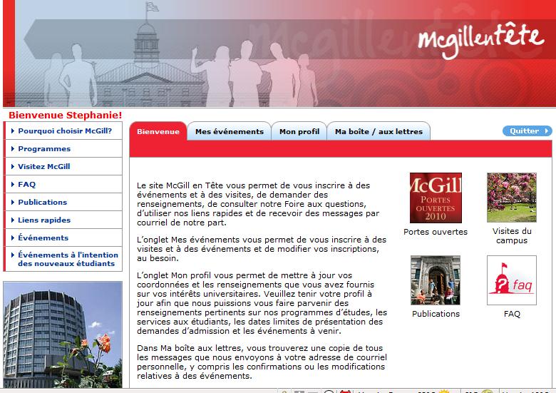 L’Université Mc Gill m’a aussi envoyé des codes d’accès pour la section de leur site réservée aux nouveaux étudiants. J’ai aussi reçu un courriel m’expliquant les raisons qui devraient m’inciter à choisir Mc Gill pour mes études en sciences infirmières, et une invitation pour leur journée d’accueil.