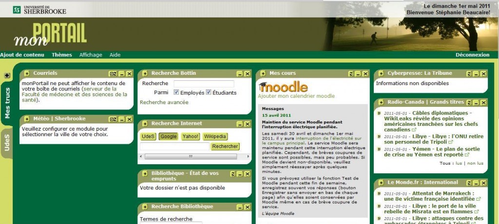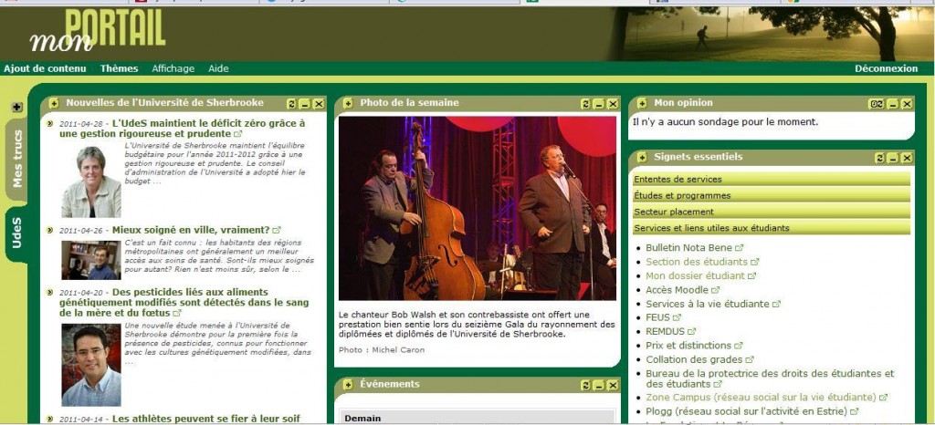 Suite aux offres d’admission que j’ai reçues des universités Mc Gill et Sherbrooke, j’ai reçu toutes sortes d’informations et de propositions de la part des deux protagonistes. Ainsi, j’ai eu un appel d’une étudiante de l’université de Sherbrooke qui voulait savoir si je comptais participer à la journée d’accueil, si j’avais décidé d’accepter l’offre d’admission, ce qui m’avait incitée à choisir Sherbrooke, etc. On m’a aussi envoyé par courriel un code d’utilisateur me permettant de me connecter à « mon portail »: ainsi, je me sens déjà étudiante à l’université de Sherbrooke puisque je peux d’ores et déjà visionner mon compte, être au courant des nouvelles de la vie estudiantine, m’inscrire à la journée d’accueil, etc. D’ailleurs, j’ai l’intention de me rendre à cette journée d’accueil, au campus de Longueuil, le 7 mai, afin d’apprivoiser les lieux avant la rentrée.