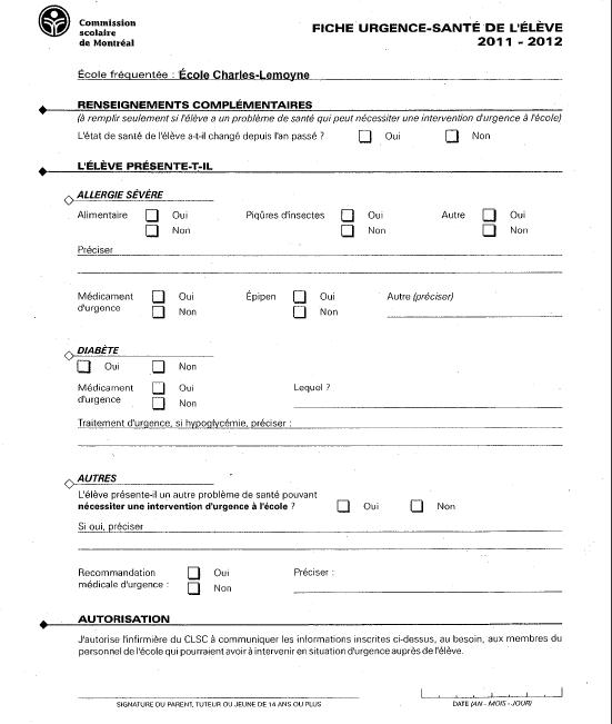 Toutefois, peu importe le type d’infirmière, en début d’année, la charge de travail administratif est assez lourde: en effet, à l’inscription les parents remplissent une fiche de santé sur laquelle ils identifient les problématiques et/ou les besoins de leur enfant en matière de santé. Ces fiches sont ensuite acheminées à l’infirmière qui doit les vérifier, les trier et les traiter. Par exemple, si un parent a inscrit sur la fiche de santé que son enfant souffre d’allergies graves et qu’il doit avoir avec lui un épipen, l’infirmière rencontre les parents pour qu’ils signent un formulaire d’autorisation de distribuer un médicament; elle rencontre aussi tous les enseignants avec qui l’enfant aura des interactions, donc son professeur mais aussi les « spécialistes » (profs d’anglais, arts plastiques, éducation physique, musique …) afin de leur prodiguer les enseignements requis au niveau des allergies et de l’utilisation de l’épipen. L’infirmière devra aussi faire le suivi avec les responsables des services alimentaires et organiser des activités d’enseignement pour expliquer aux compagnons de classe de l’enfant les restrictions et les conséquences reliées à une allergie grave. Le mécanisme est le même pour tous les problèmes de santé qui nécessitent un suivi pendant les heures de classe, avec un degré de complexité dans la tâche qui fluctue selon la gravité et la rareté de la situation: ainsi les élèves et les enseignants sont assez habitués de composer avec l’asthme, alors qu’un élève qui souffre d’un diabète de type 1 entraîne toute une chaîne d’interventions et de formations plus spécifiques.