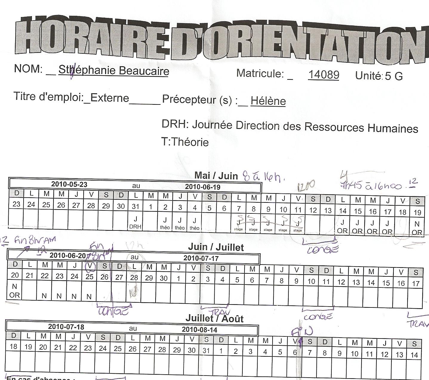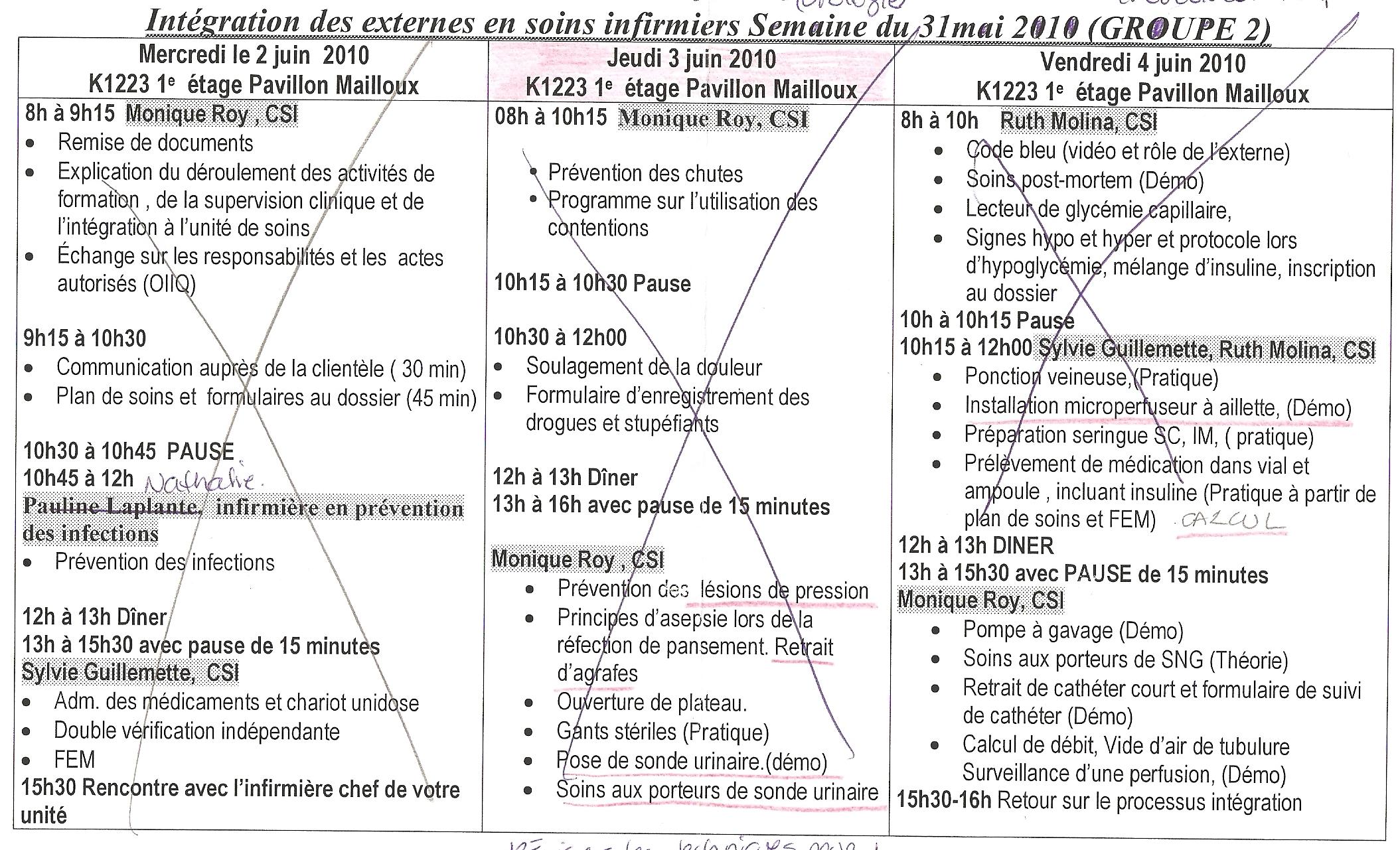 Lors de la première journée théorique on nous a remis un horaire pour la semaine de supervision clinique, qui suit la théorie, et pour les 6 jours d’orientation en jumelage avec une infirmière. Il s’agissait du document suivant: