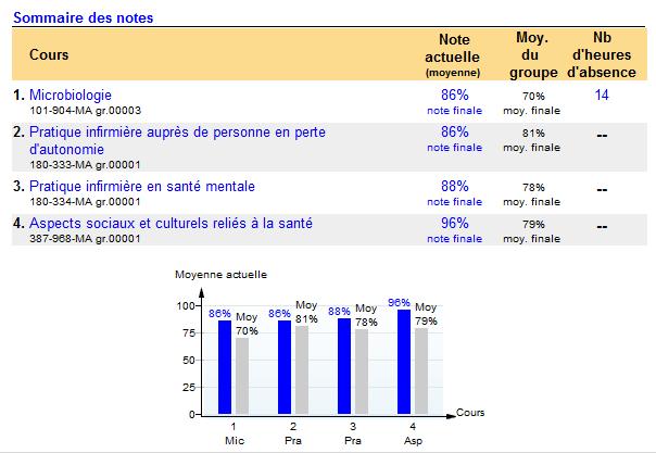 Et voilà! après une trop longue attente due à l’entêtement, la mauvaise foi et la nonchalance d’un prof de bio, mes notes finales sont toutes sorties. Je n’avais pas trop de stress par rapport à la note de bio puisqu’il me fallait 1.1/30 pour réussir la session, mais quand même, c’est bon d’avoir la confirmation! Avec 27/39, j’ai donc eu plus de 24 fois plus de points que nécessaire! J’ai obtenu ma meilleure note de la session à l’examen final, ce qui est quand même curieux et inhabituel … mais bon, on ne s’obstinera pas!